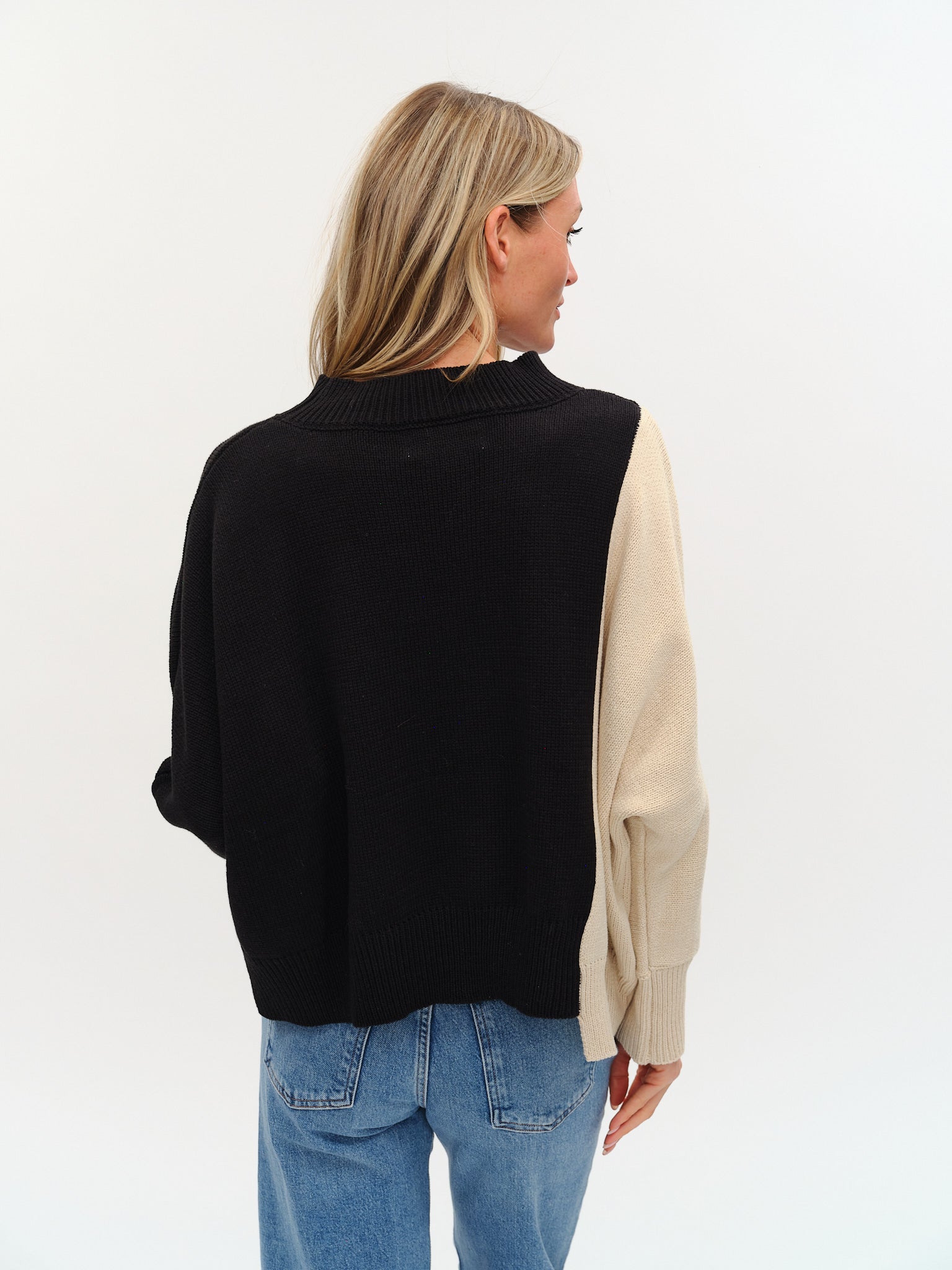 The Quinn Sweater in the black/tan features a trendy and bold colorblock design for standout style. Its oversized fit and cozy mockneck provide unmatched comfort with ribbed cuffs and hem to keep it classy with a modern twist. This two-toned sweater is perfect for layering and effortlessly elevates any casual outfit.