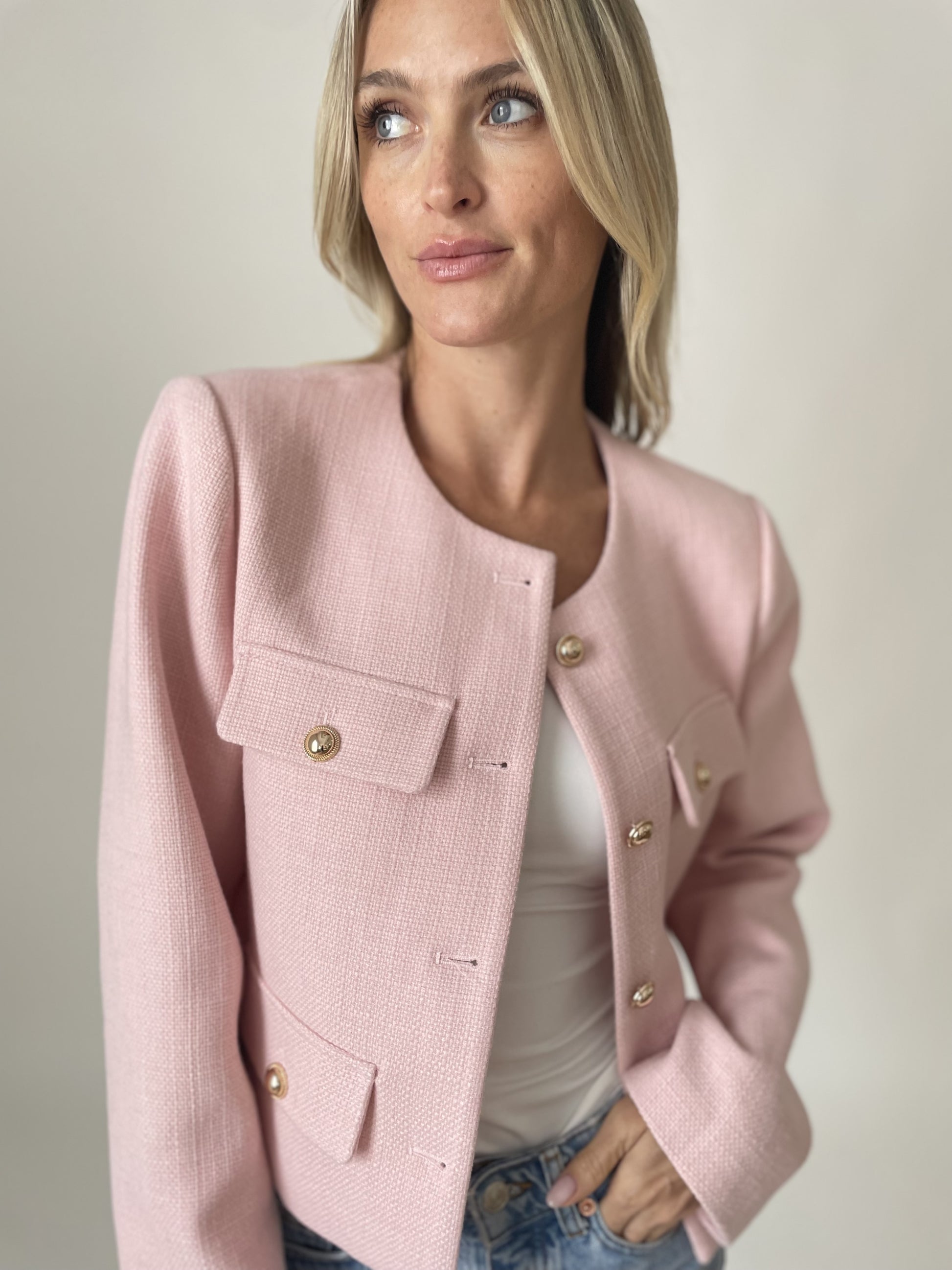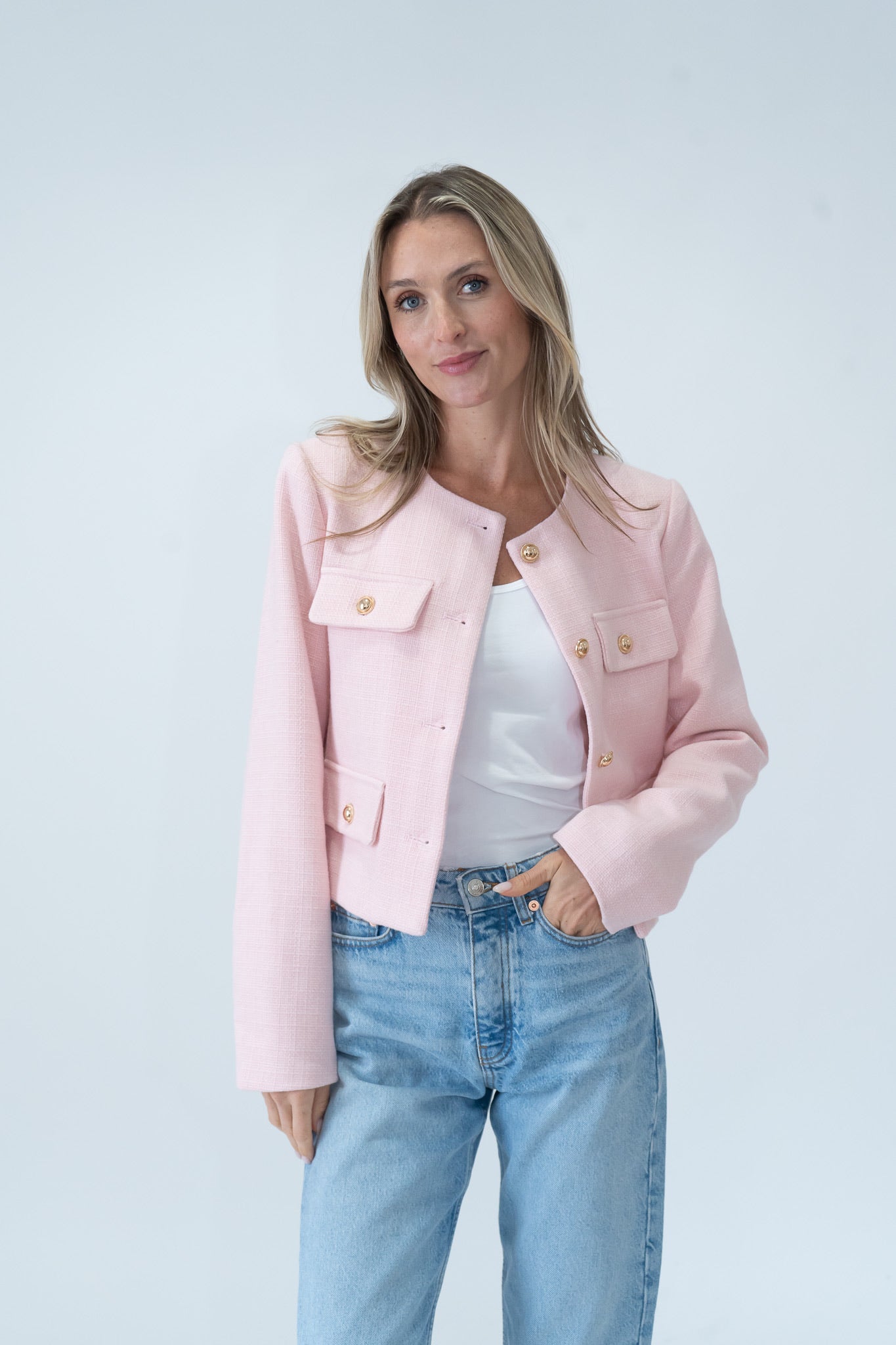 The Blakely blazer is here featuring a round collar and lots of pockets for both style and functionality. Whether you want to wear this blazer open or closed, the polished gold buttons give you the option. Find the Blakely in our black, ivory and pink rose colors!