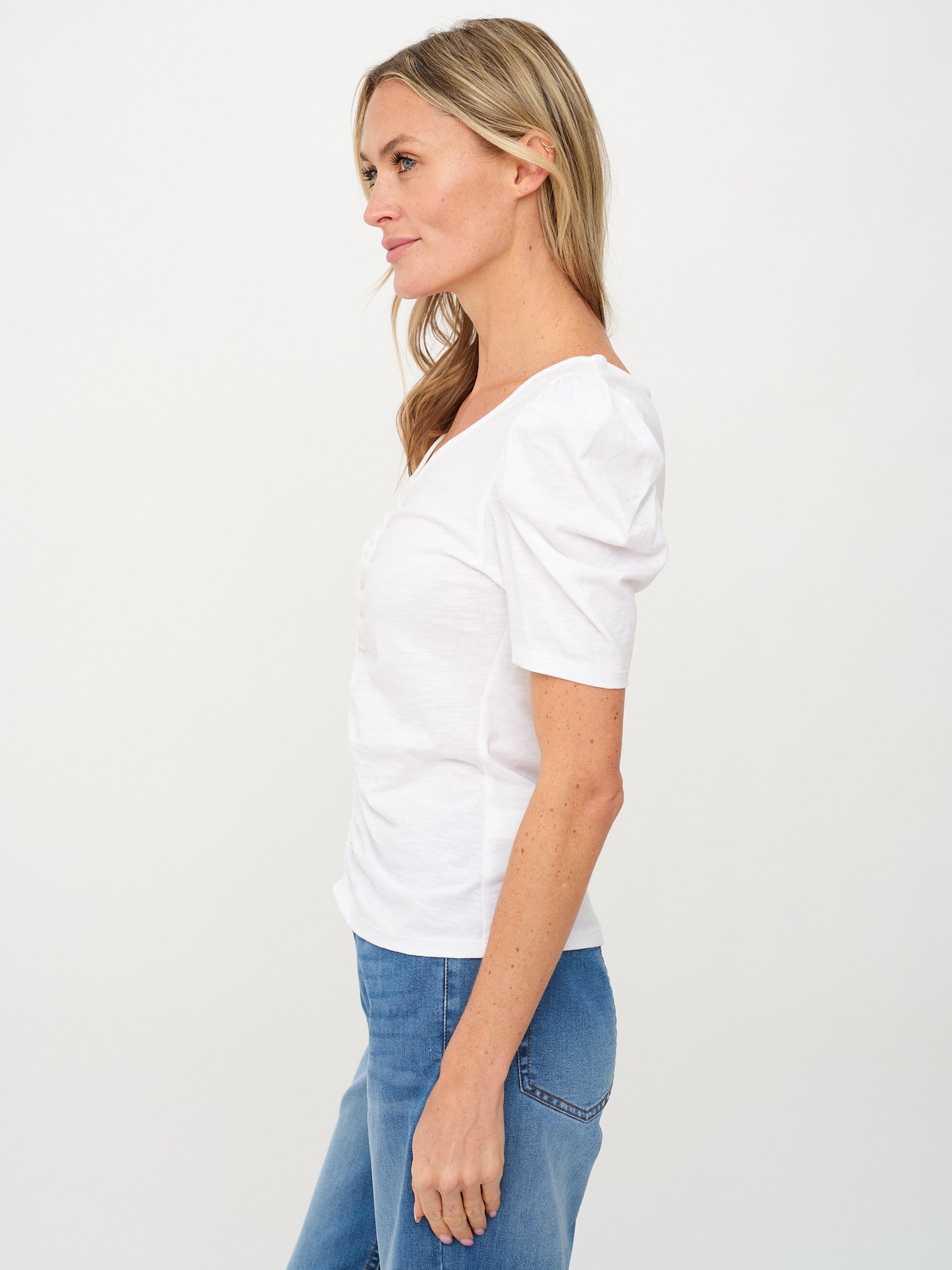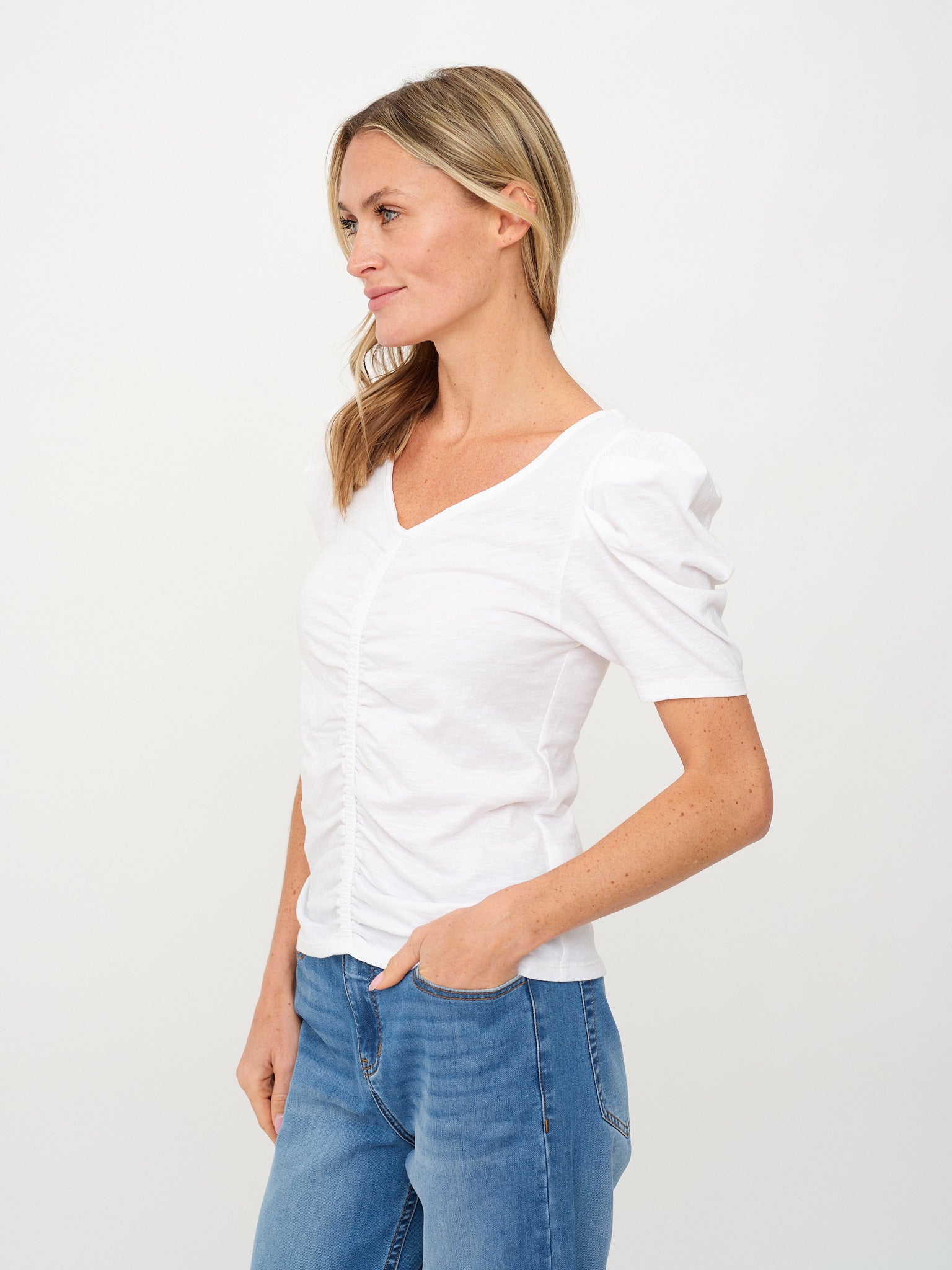 Introducing the Camilla Tee! Featuring charming puffed sleeves and ruching down the center, this lightweight v neck tee is perfect for everyday wear. Stay cool and stylish with its short sleeves. Who says basics have to be boring? Not us!