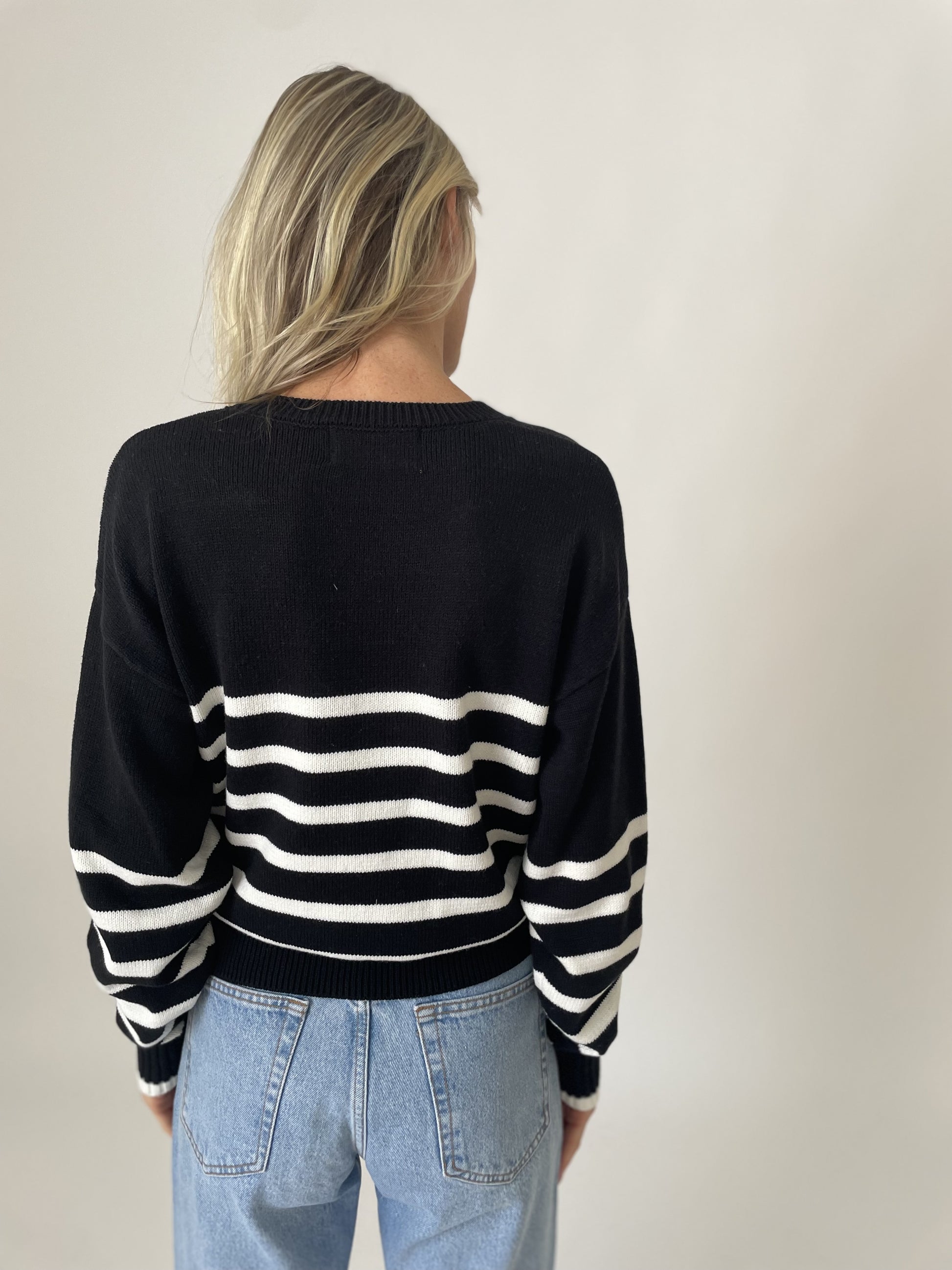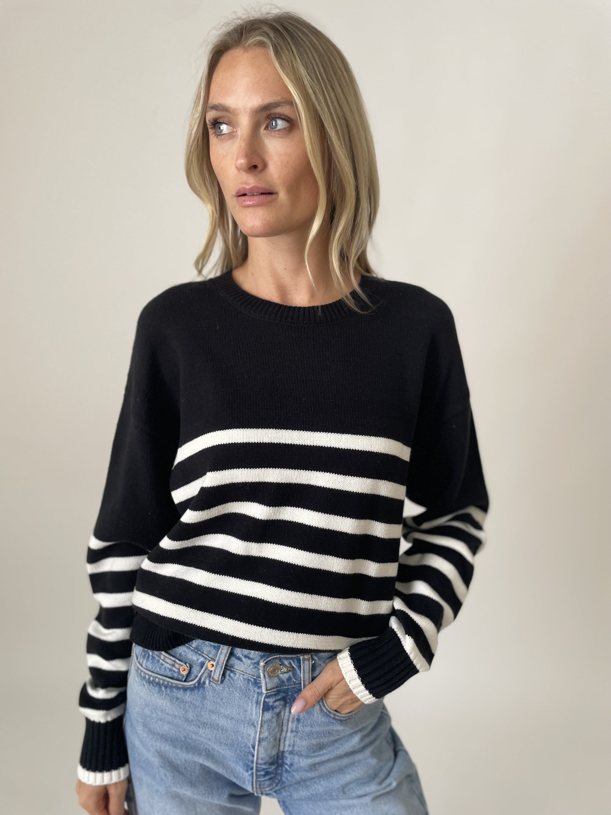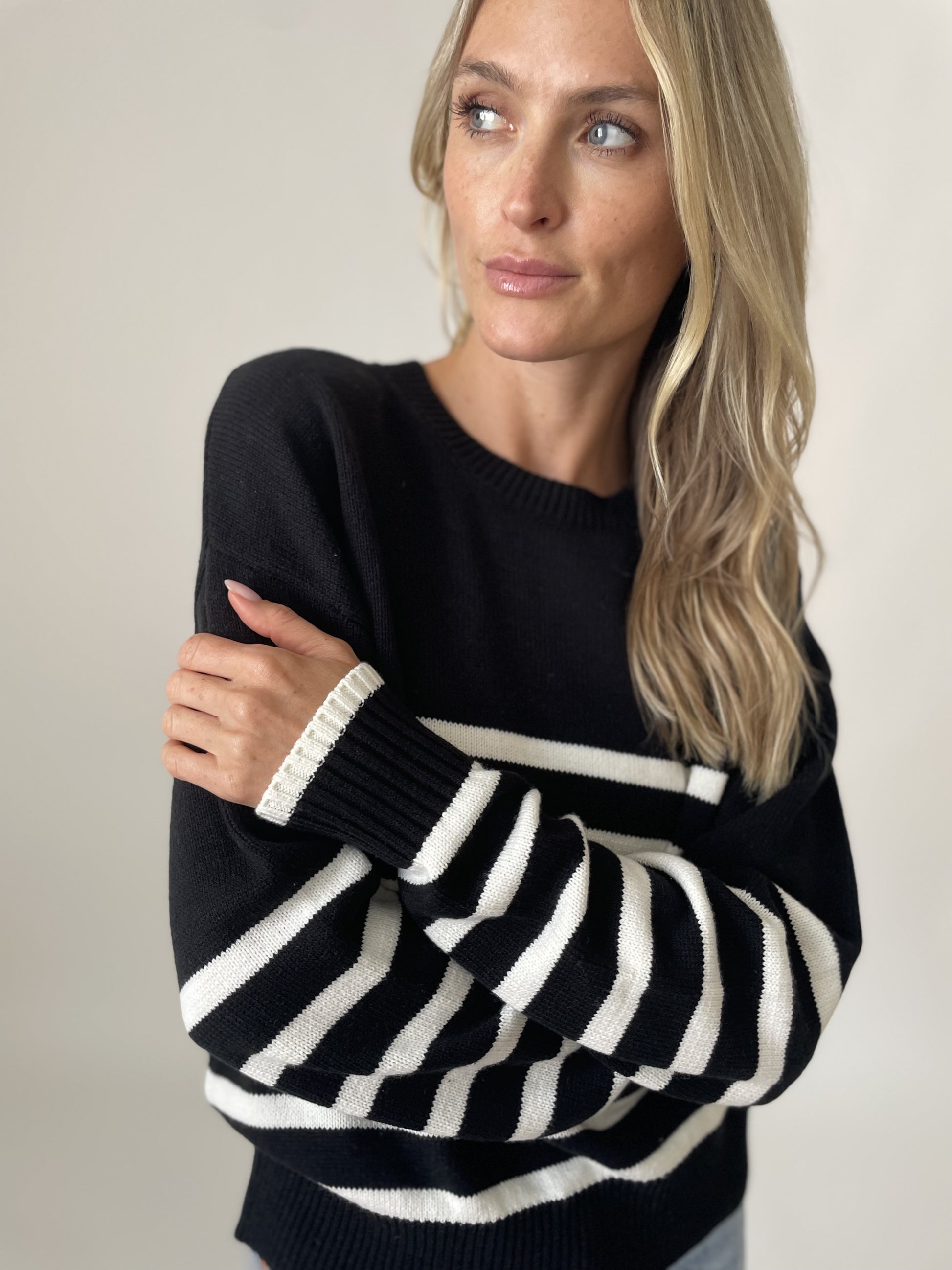 With a round ribbed neckline and dropped shoulders, the Carleigh sweater can be found in its striped style in two colors: black with white and white with black. Give the Carleigh sweater a french tuck into your favorite denim and your choice of sneakers or boots for a complete look!