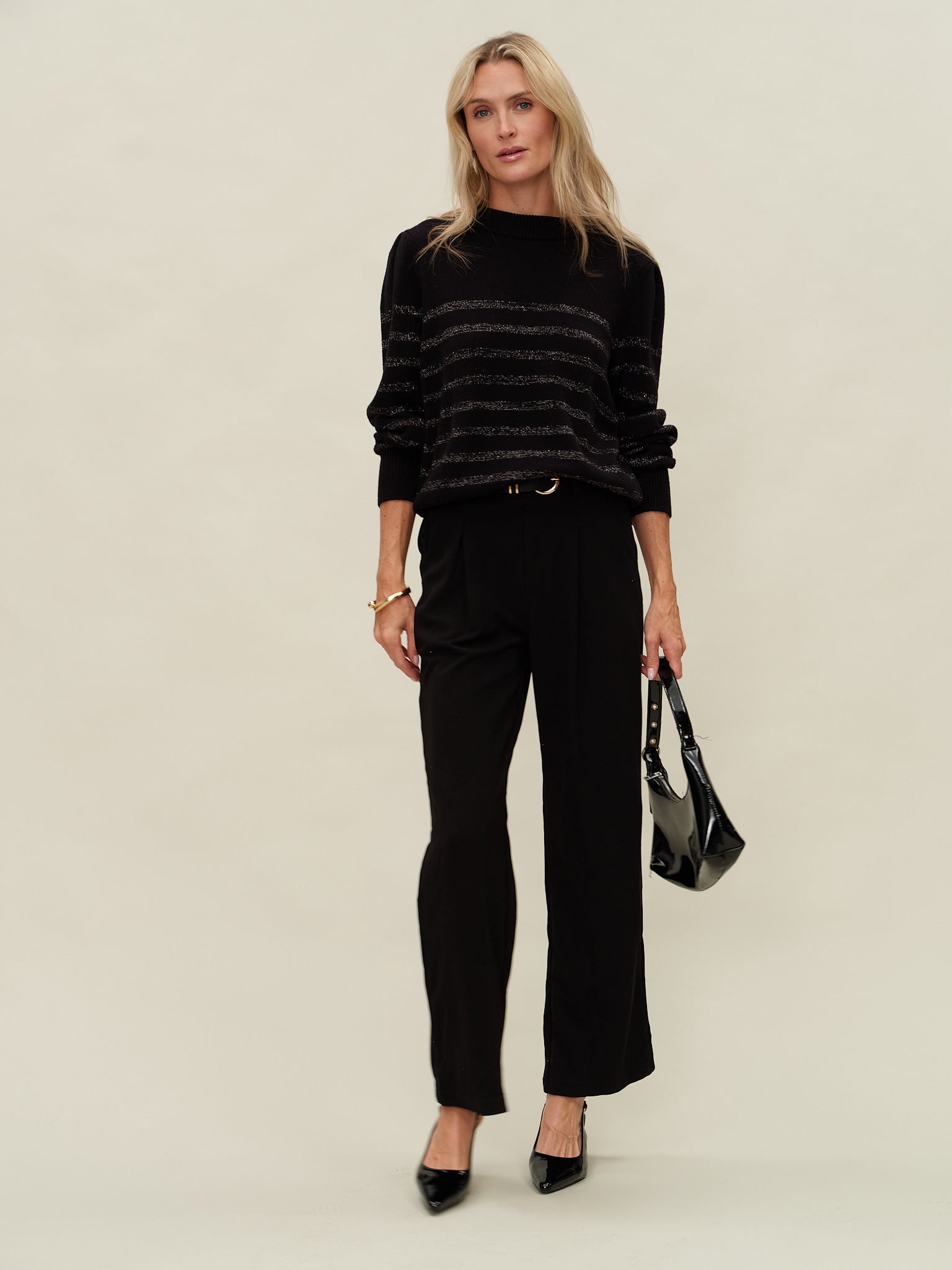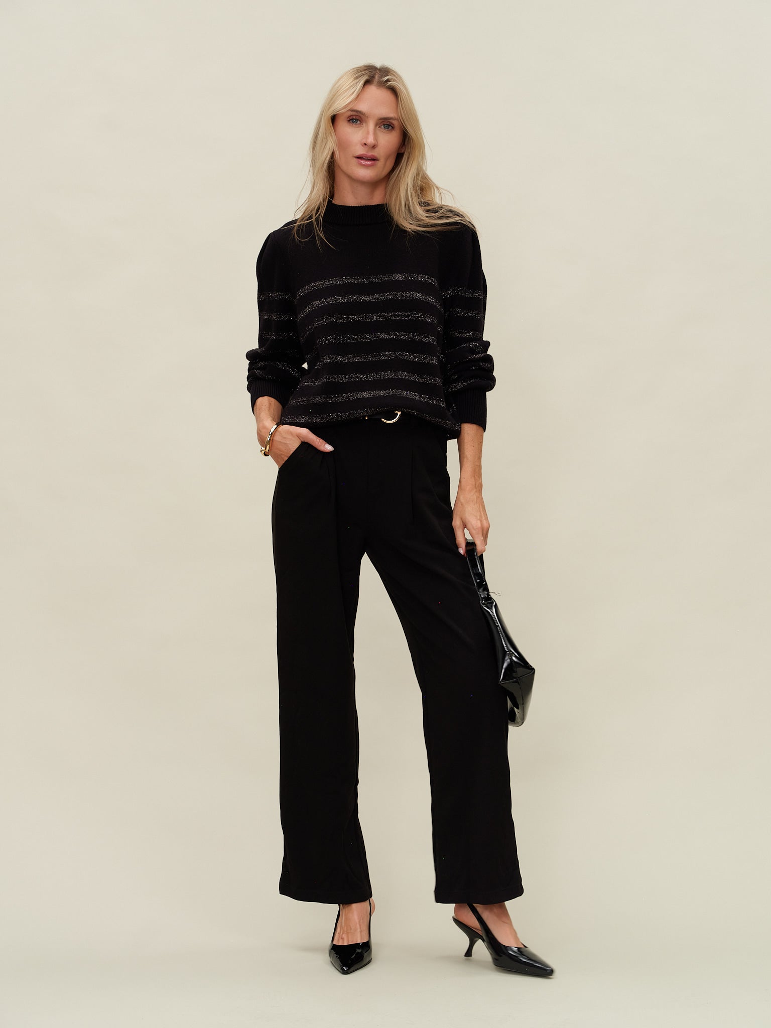 Experience cozy warmth and subtle sparkle with the Sarah Sweater. Its ribbed mockneck and cuffs provide a comfortable yet fitted silhouette, while soft fabric ensures all-day comfort. The elegant sparkly stripes add a stylish touch without compromising warmth. Designed to be fitted with just enough room, this sweater moves with you, making it perfect for chilly days when you want to look effortlessly polished and feel cozy.