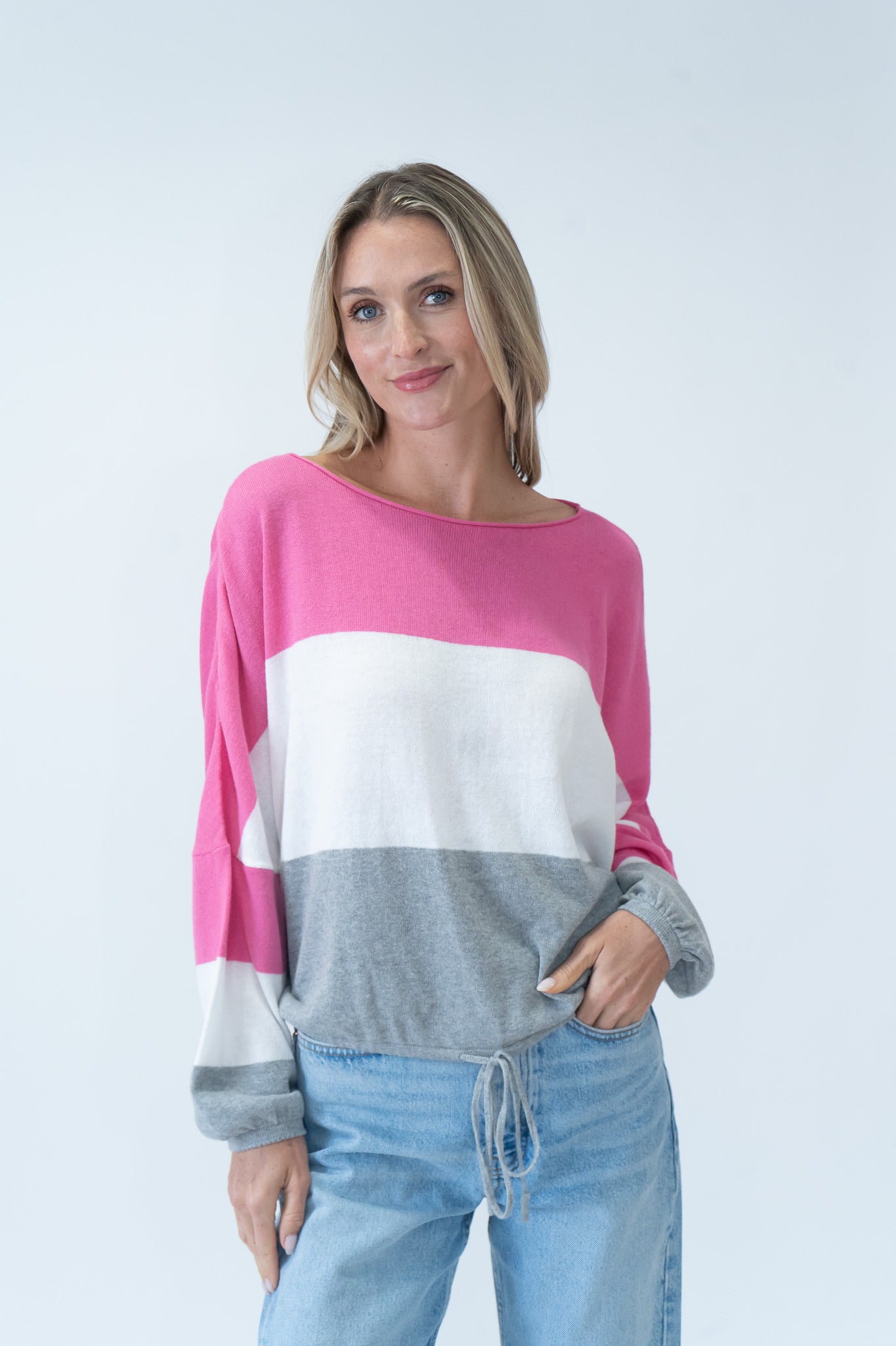 This Spring season, Georgia is a breath of fresh air. The lightweight 100% cotton sweater comes in three bright colors: aqua, pink, and yellow.