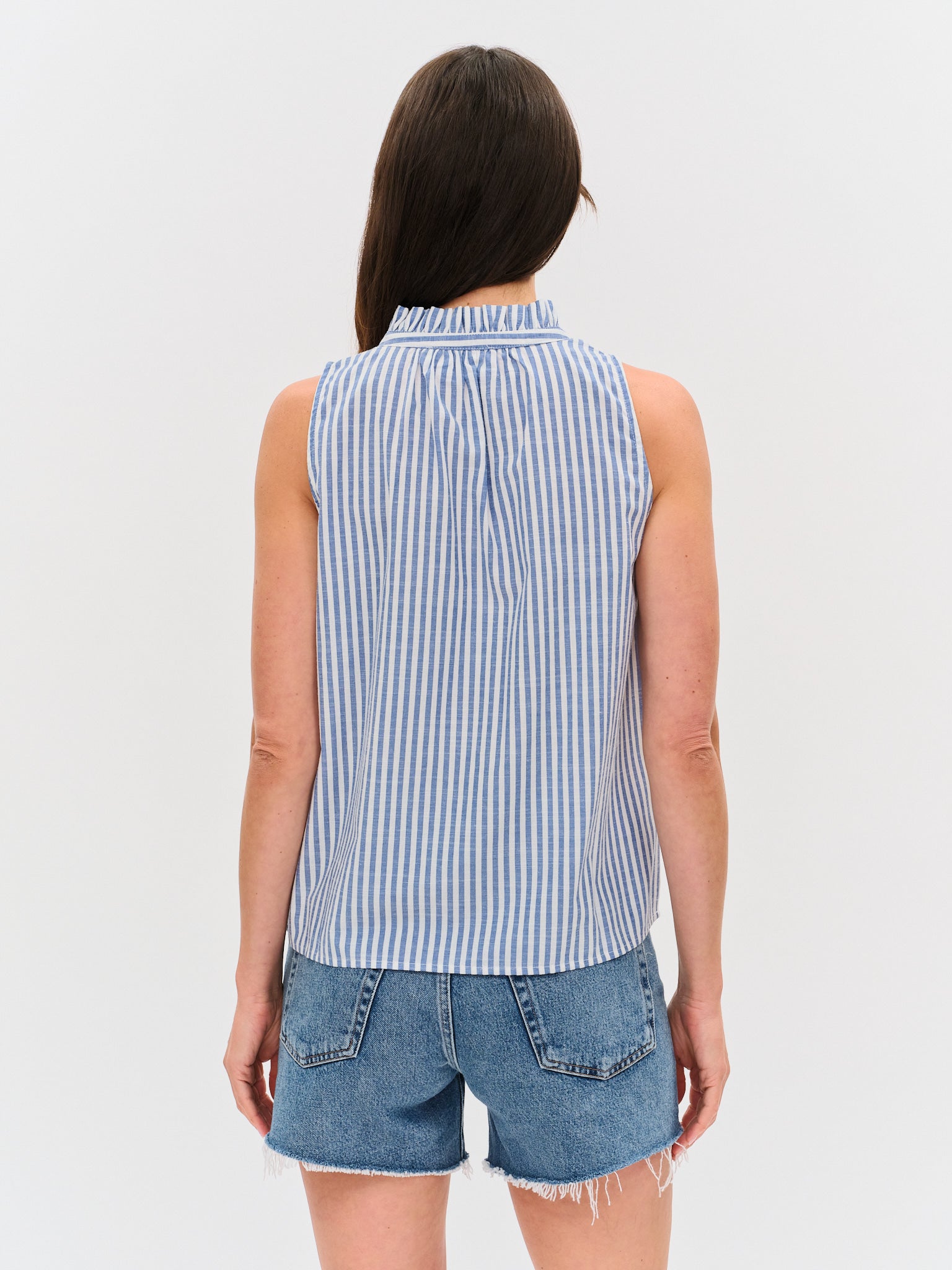 The charming Harbor Top, designed to turn heads with its distinctive high neckline adorned with delicate ruffles. The keyhole cutout at the neck pairs perfectly with ties that let you create an elegant bow, giving you complete control over your look. Featuring an effortlessly chic open shoulder silhouette and stripe detailing, this breathable top transitions seamlessly from casual days to evening outings.