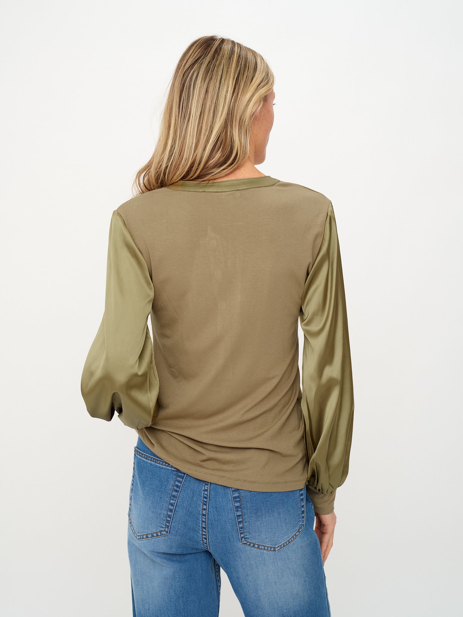 Stylish and sophisticated, the Janie top makes a great addition to any wardrobe. The Janie can be paired with a denim of choice with our variety of color options. A ribbed body, collarless neckline, and satin sleeves enhance this top.