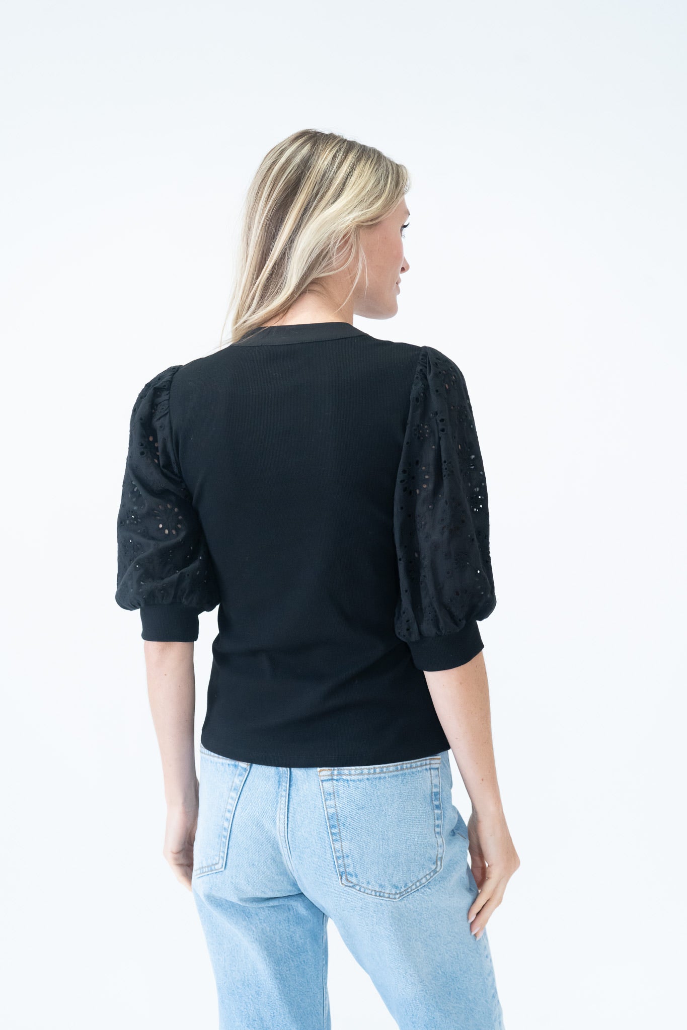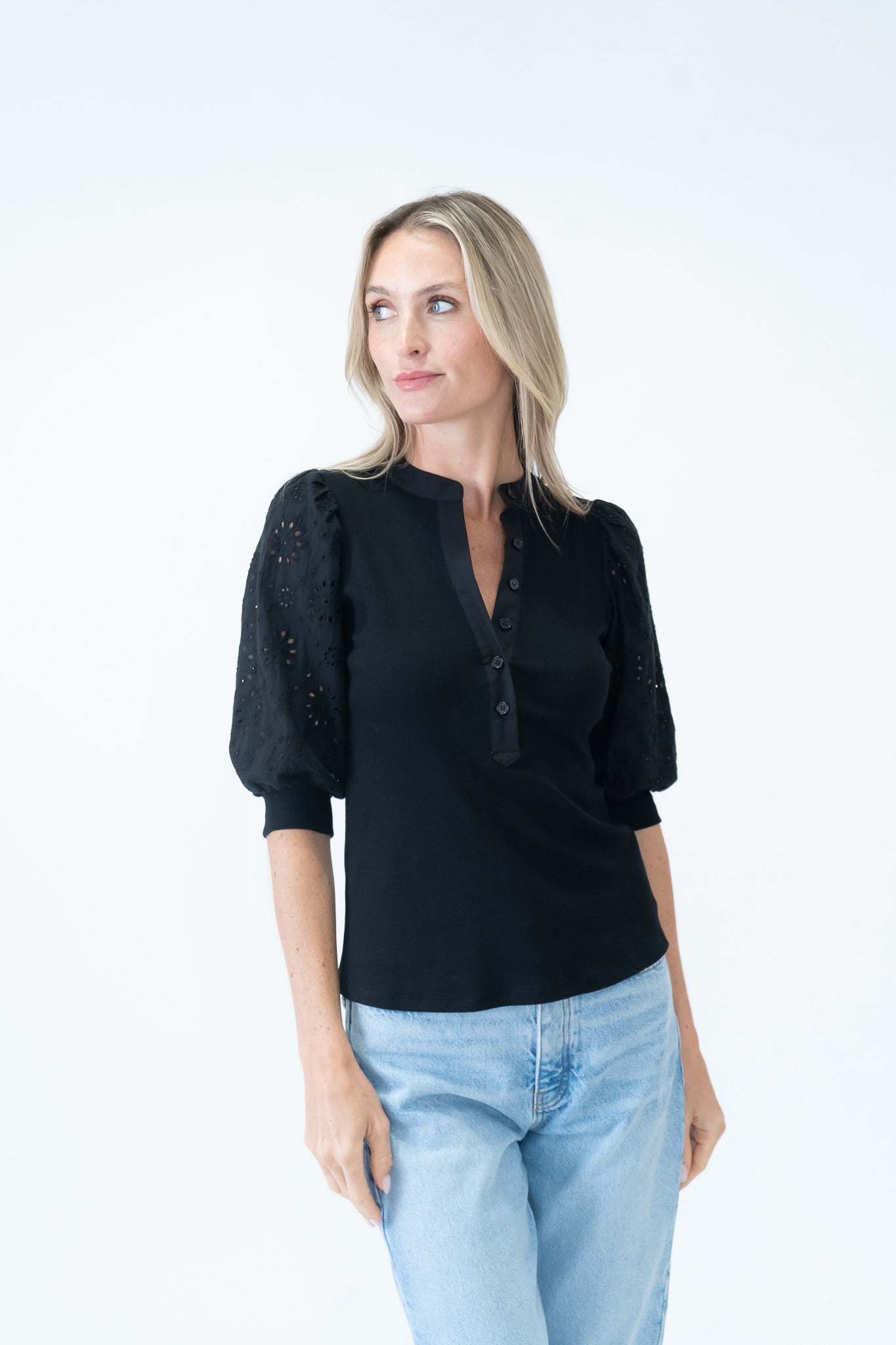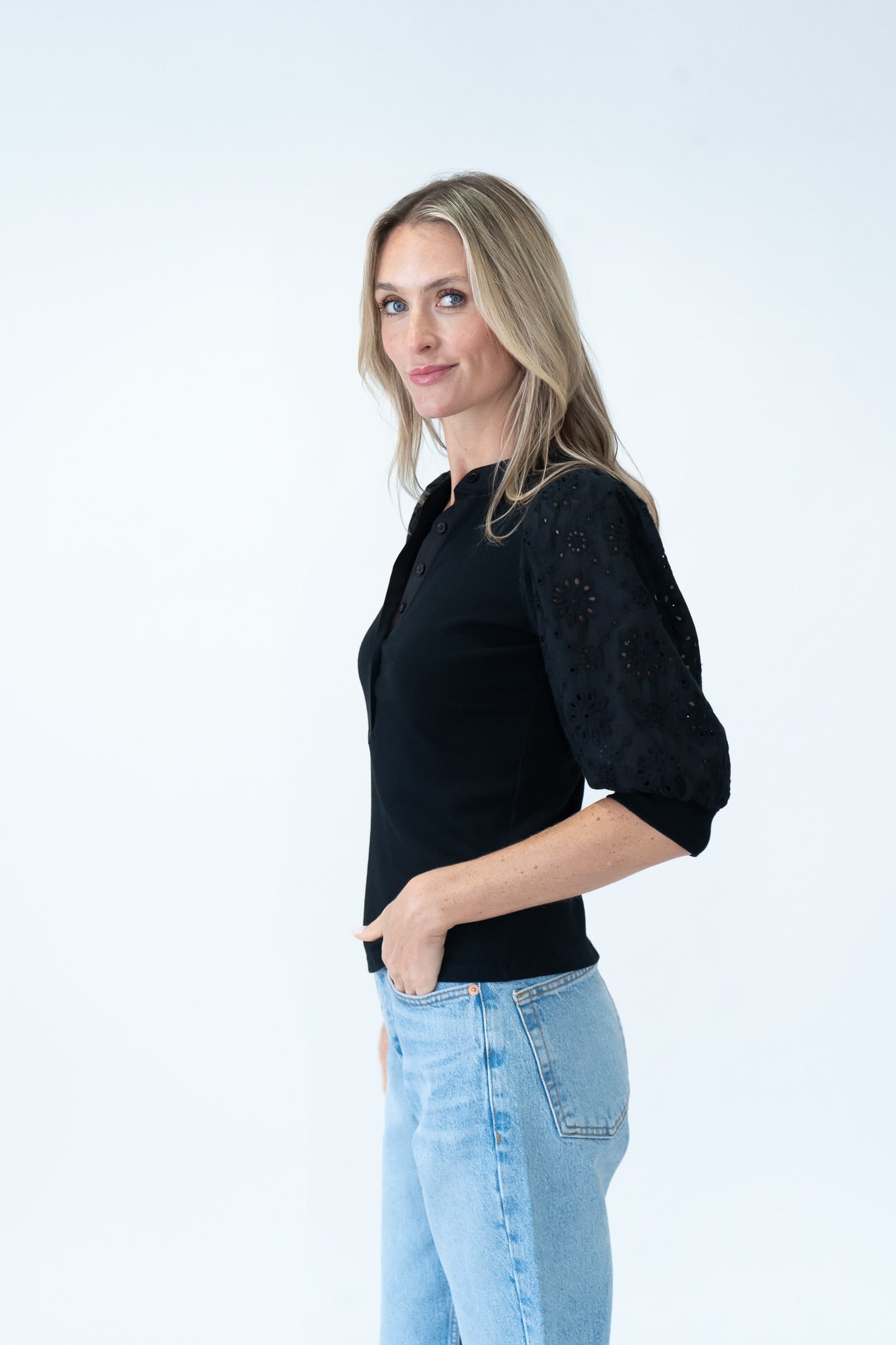 Wanting a casual but chic top, look no further, the Kaleigh Top's got you! The 3/4 button down neckline with blouson broderie anglaise elbow sleeves elevates any outfit. Pair it with your favorite jeans and heels for cocktail night!