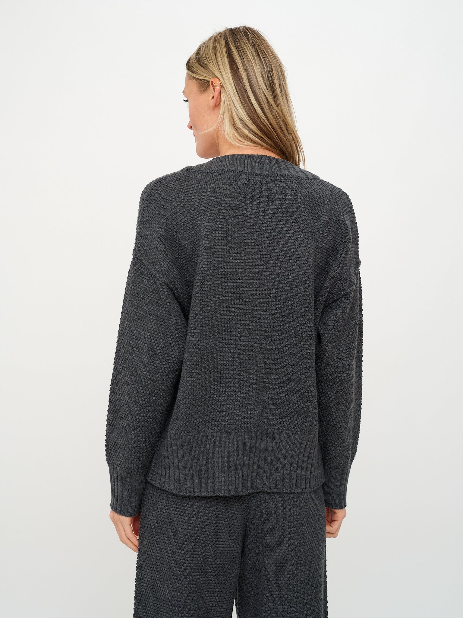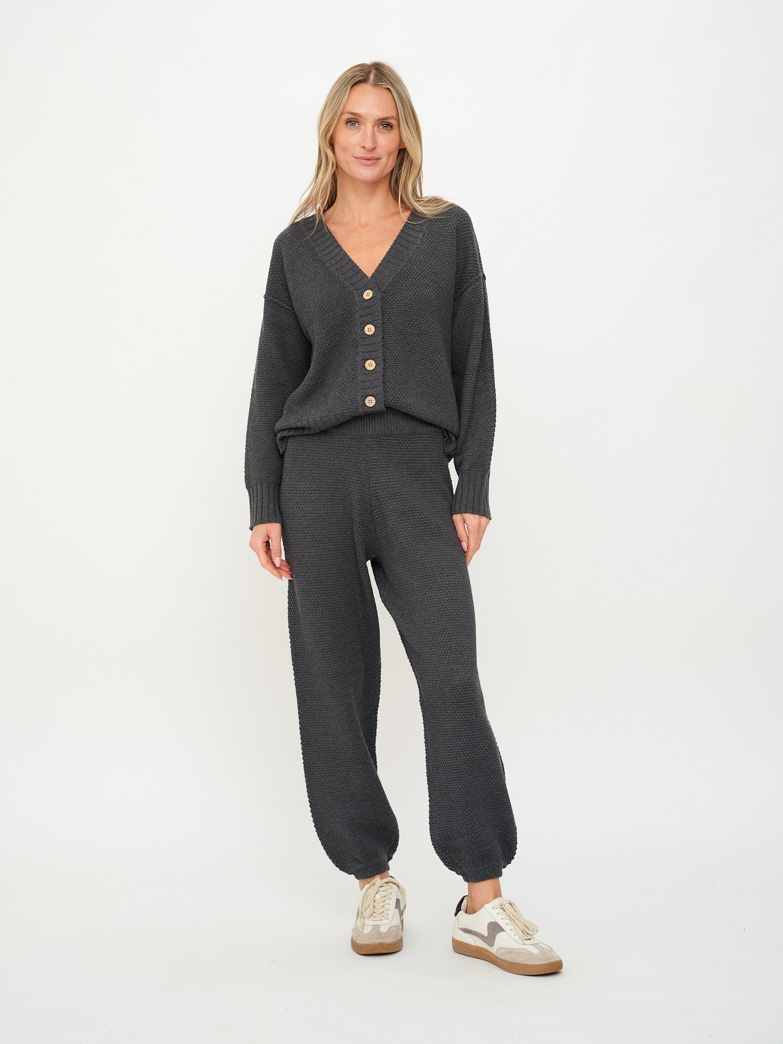 Elevate your layering game with the Molly Cardigan. This waffle-knit sweater features a classic button-down front, offering cozy warmth and effortless style. Comfortable and versatile, it pairs perfectly with its matching pants for a coordinated, polished look.