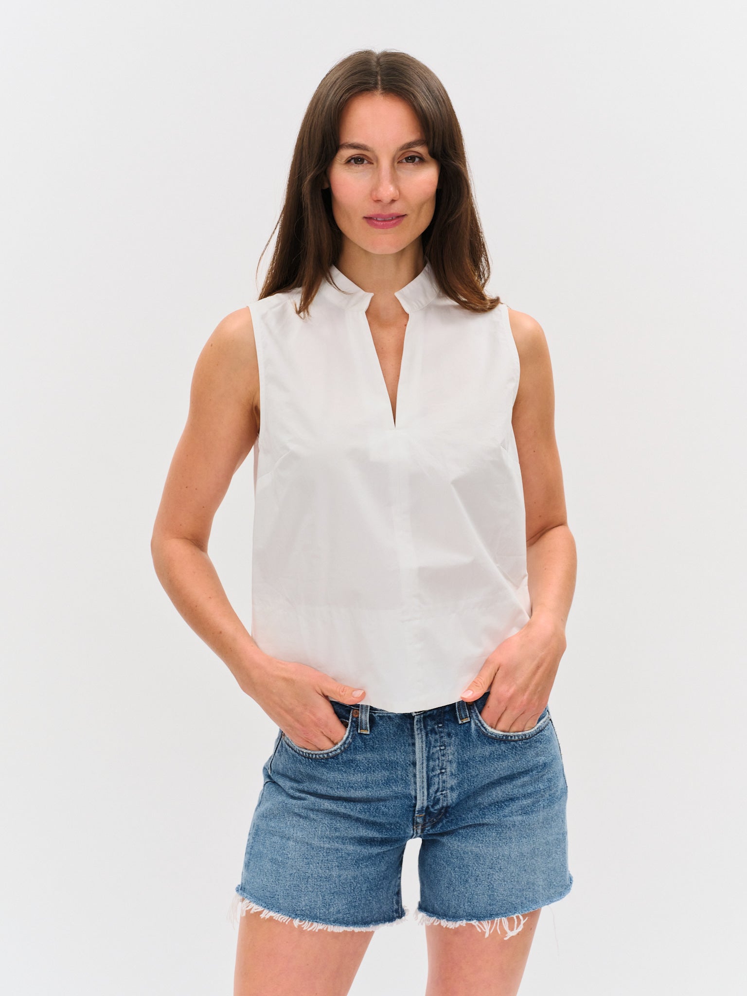 The Monroe Top combines crisp poplin shirting with a distinctive mandarin collar featuring a sharp v notch, a refined detail that sets it apart. Lightweight and breathable fabric keeps you comfortable throughout the day, while the relaxed fit offers freedom of movement without sacrificing polish. Perfect for layering or wearing solo, this off white essential transitions seamlessly from casual to dressed up occasions.