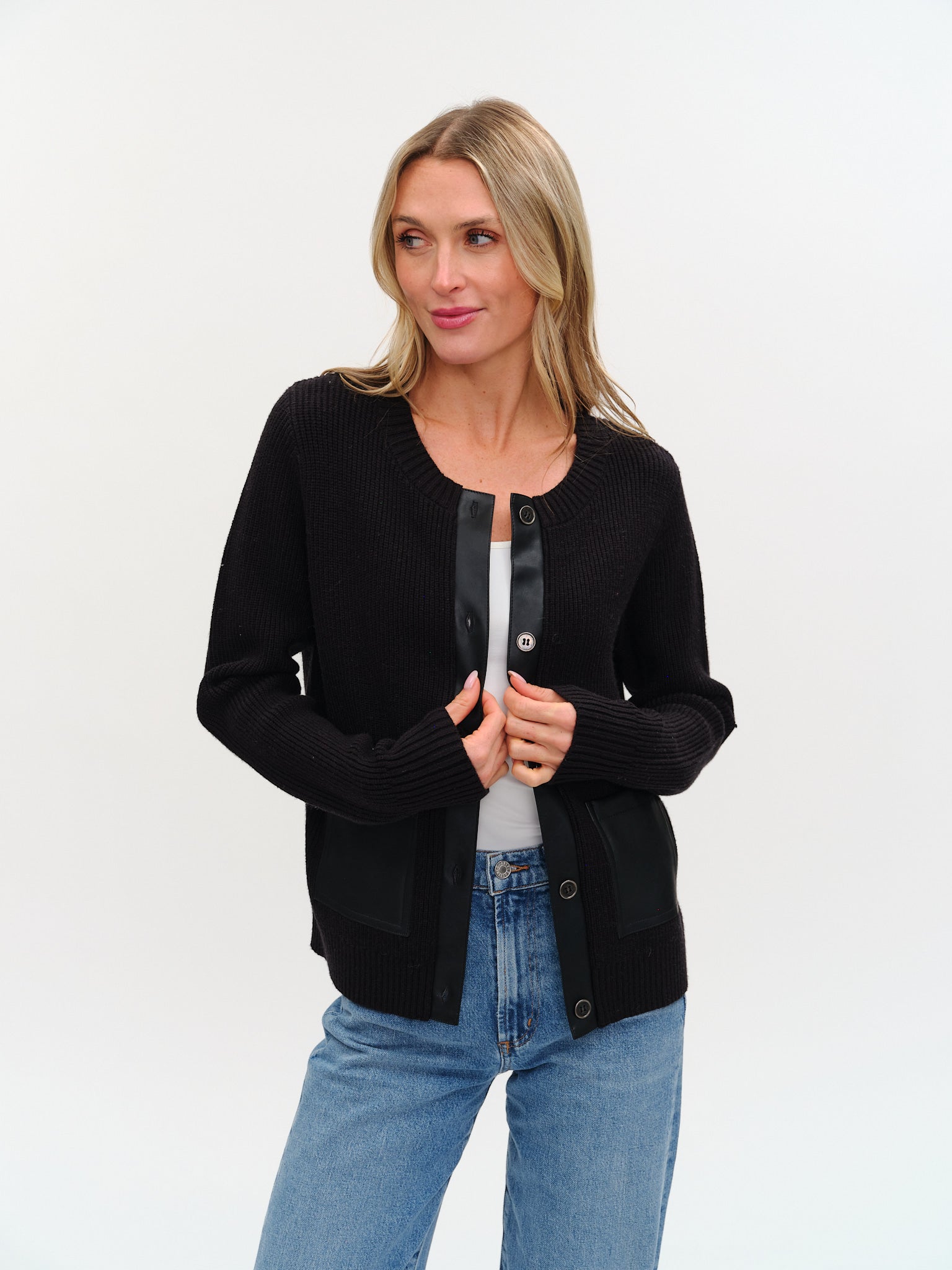 Experience warmth and style with the Natalia Cardigan. Designed with thick ribbed fabric, it offers cozy comfort for cooler days. Faux leather accents on the functional pockets and center trim add a sleek, modern edge while enhancing functionality. Secured with metal buttons, this cardigan balances practicality and sophistication, making it a versatile addition to your wardrobe.