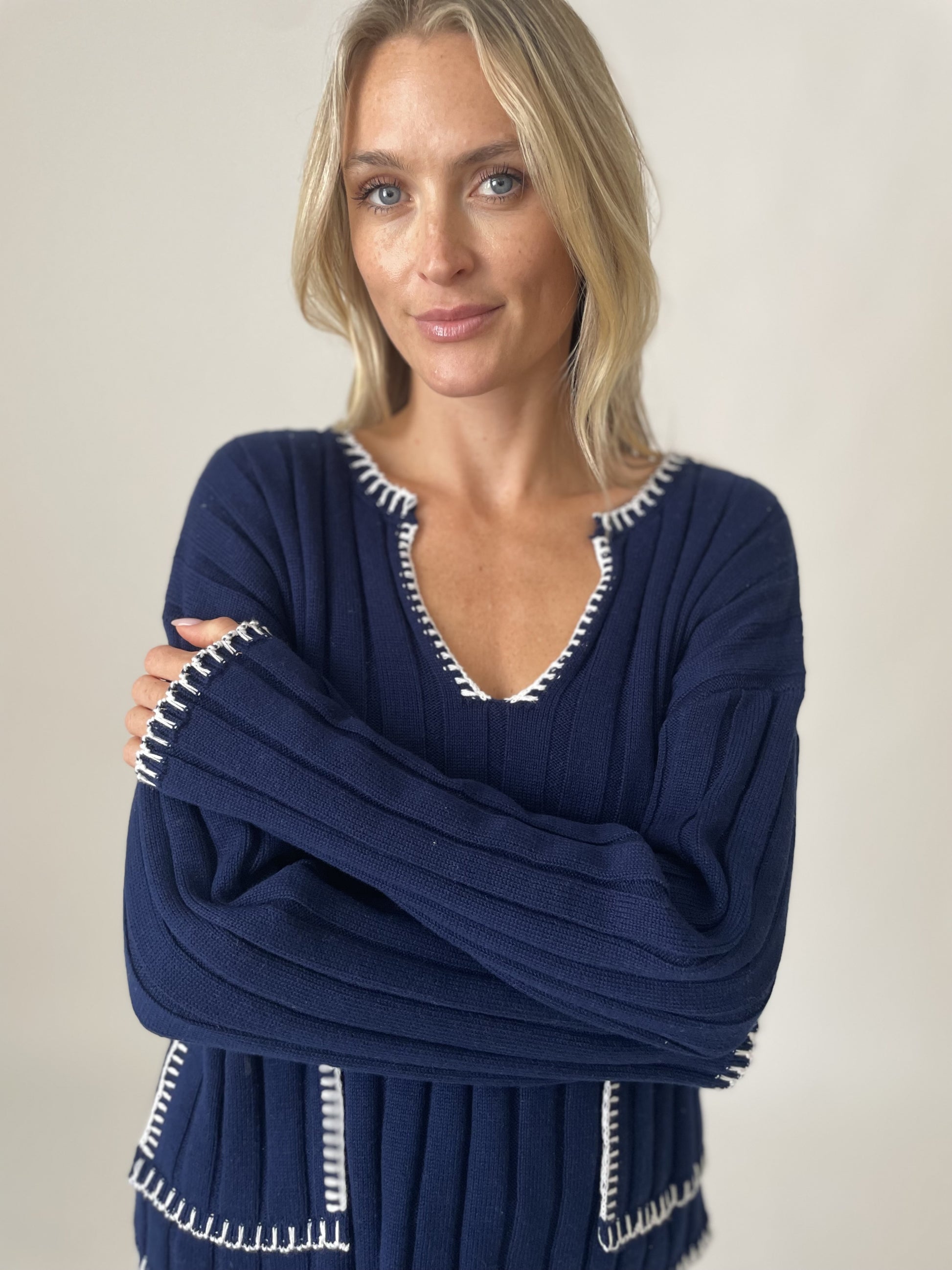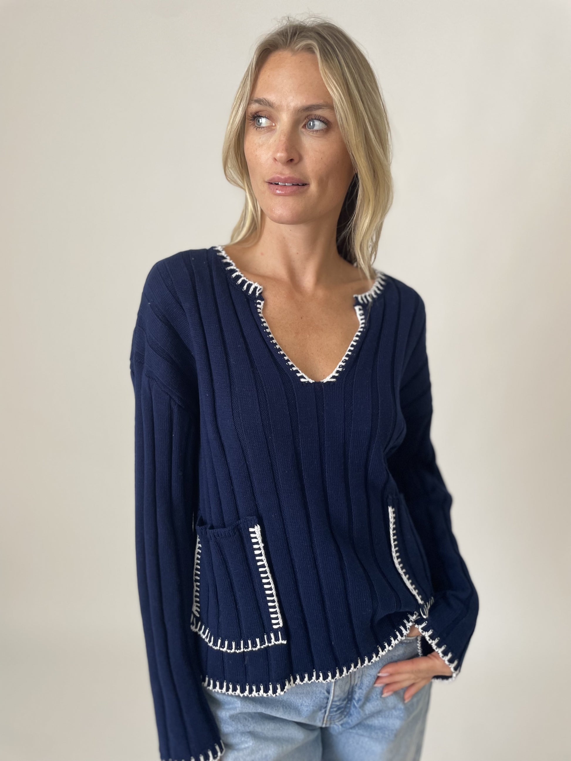 This cozy v-neck sweater features exposed stitch seams, patch pockets and a thick ribbed style. The Northport sweater can be paired with denim of choice as it comes in navy and bone. Stay warm with the Northport in your wardrobe!