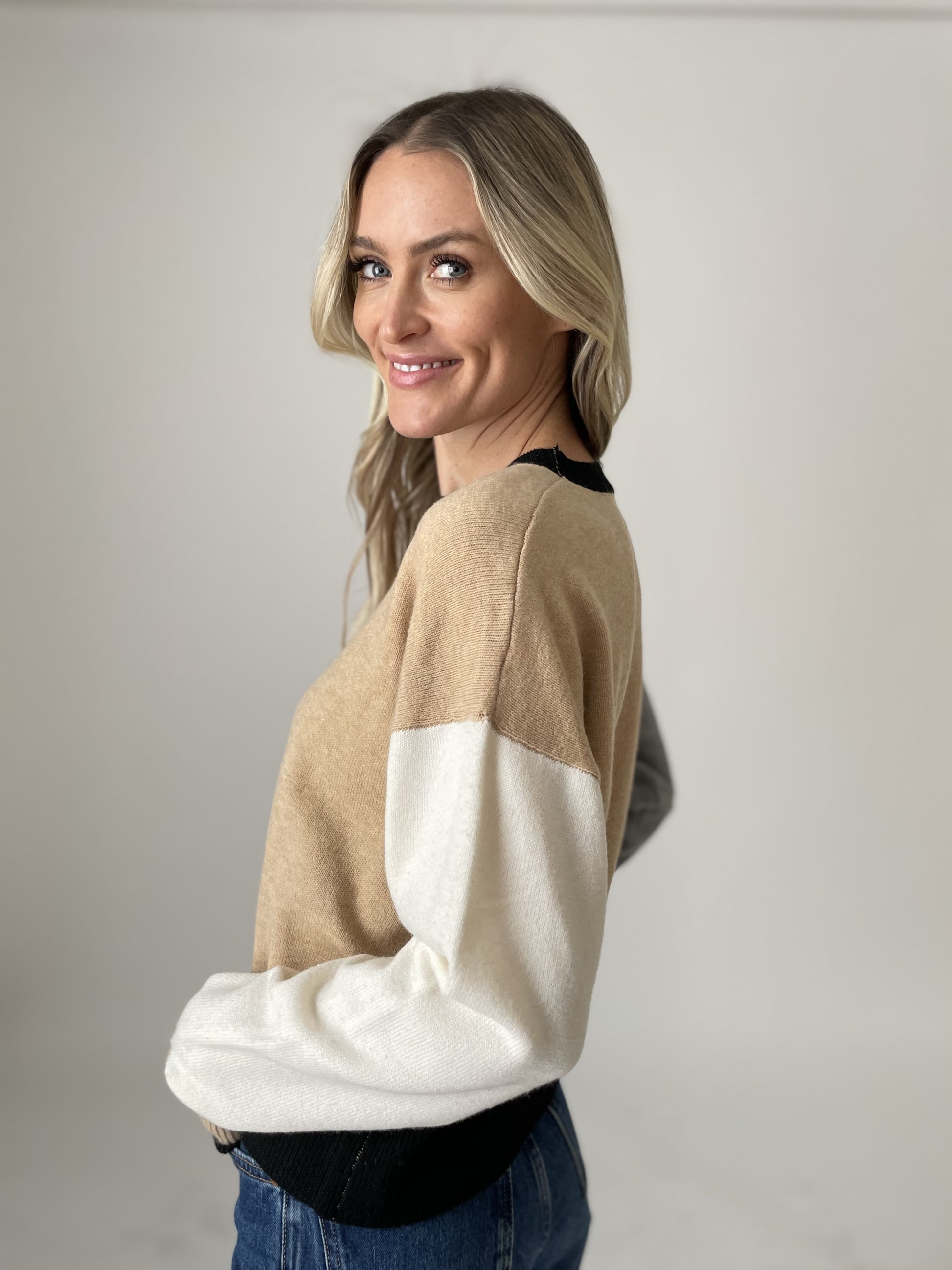 If neutrals are your thing, you'll love this colorblock crewneck! When paired with your favorite denim and boots, this sweater creates the perfect go-to outfit.