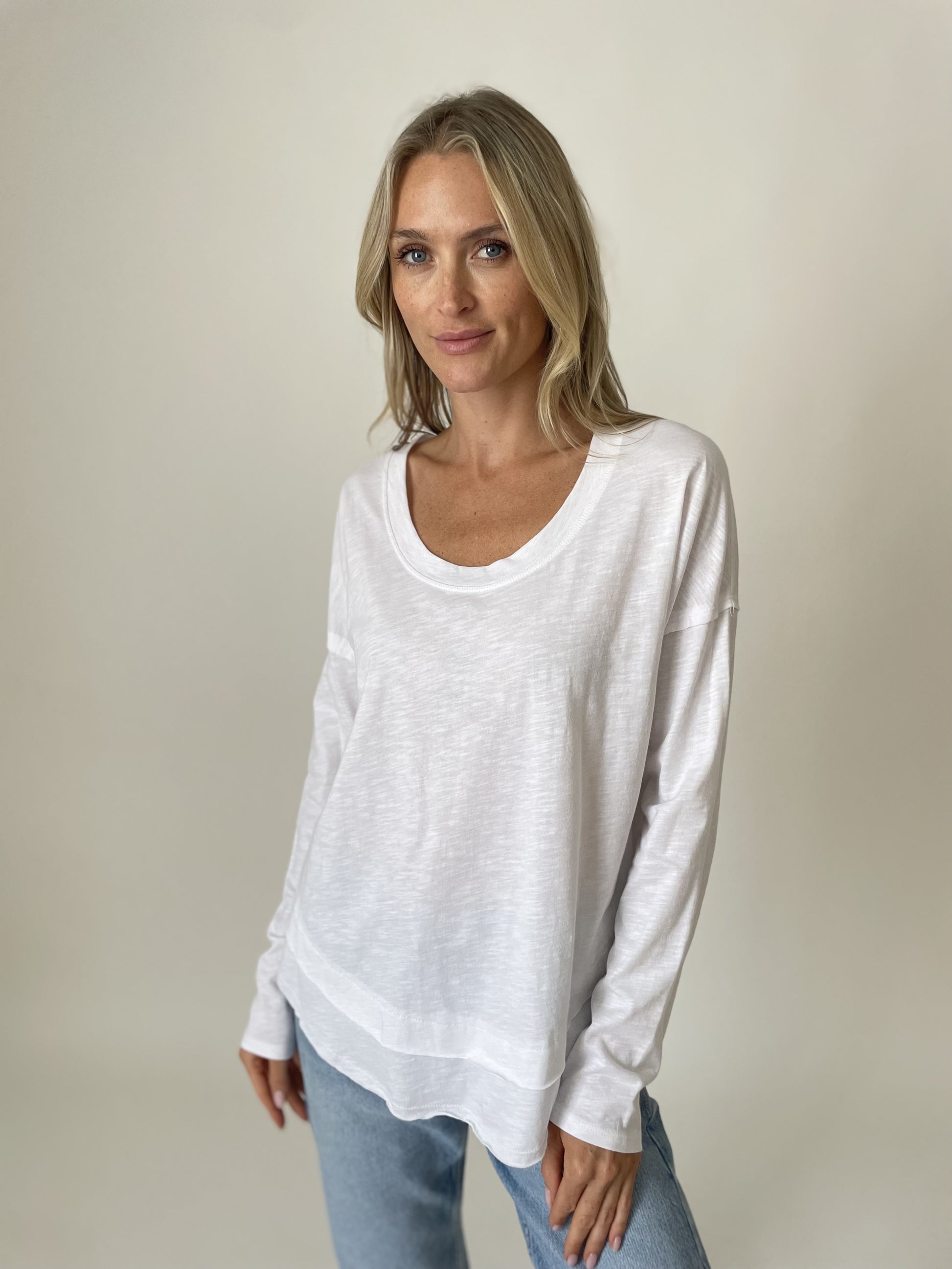 Simple, chic and comfortable is what you’ll find with the Reagan tee. Featuring a double layered style, this tee can be found in four colors: black, navy, white and aquamarine. The Raegan can be paired with sneakers and denim of choice.