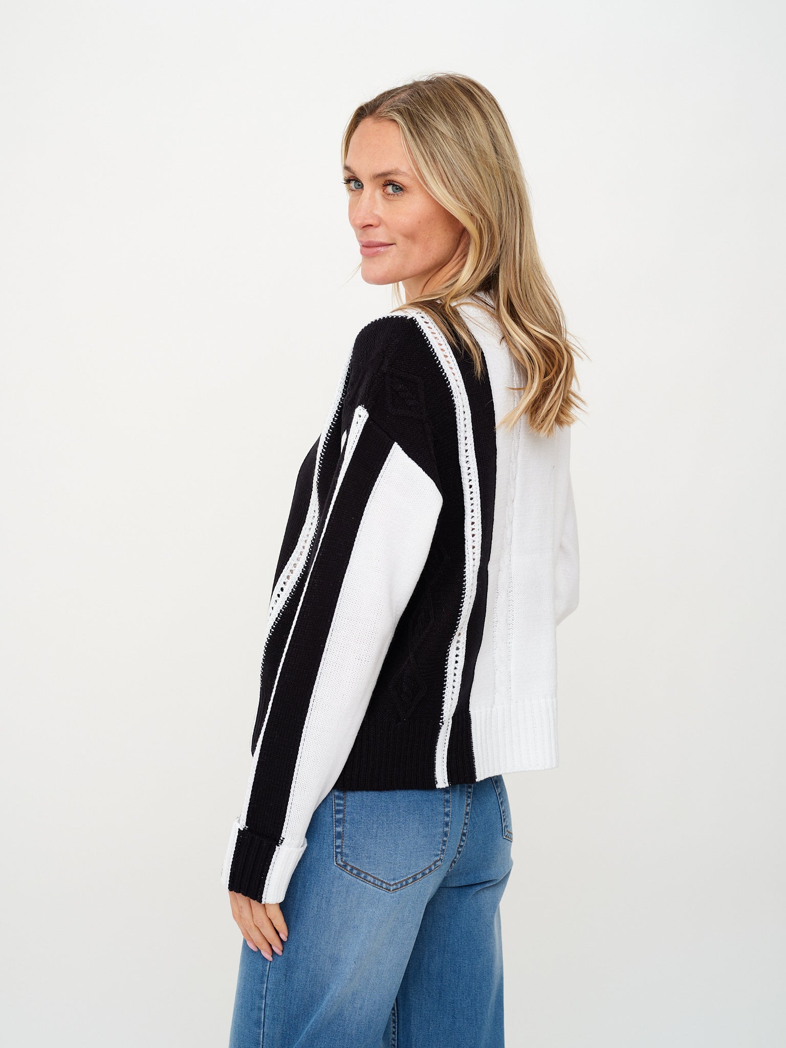 The Ruby Sweater in black and white offers a stylish blend of classic colors and cozy warmth. Designed to complement any outfit, this sweater provides both comfort and a bold, modern look. Perfect for layering or wearing on its own.