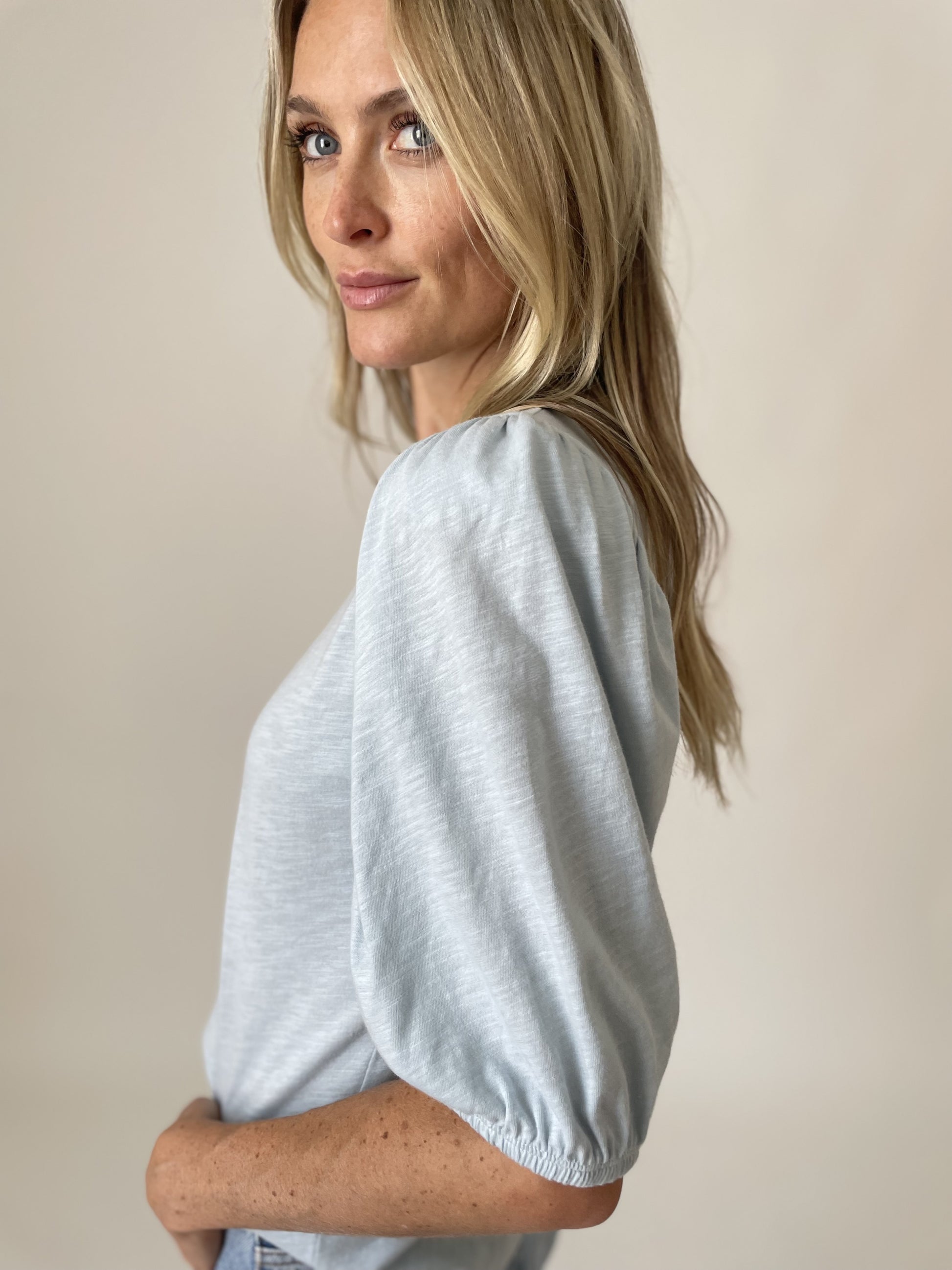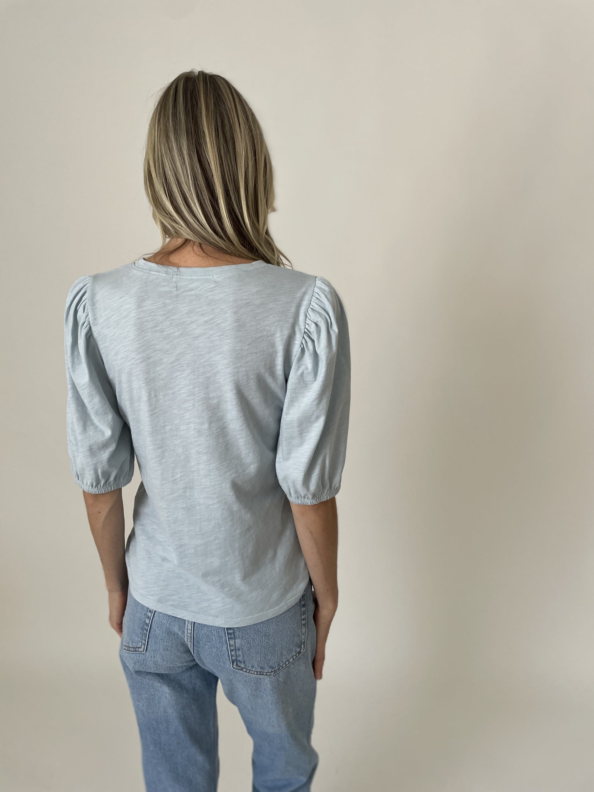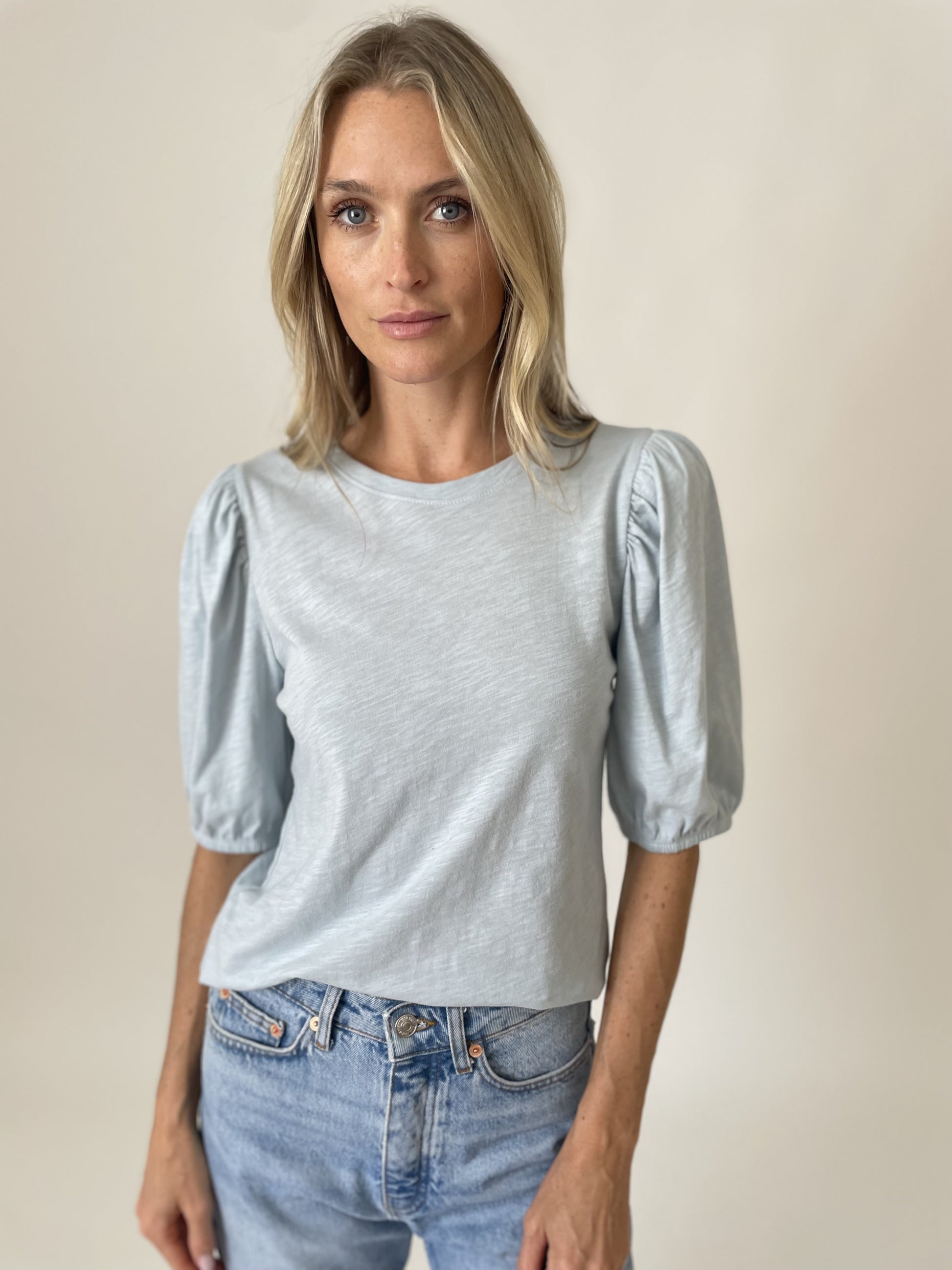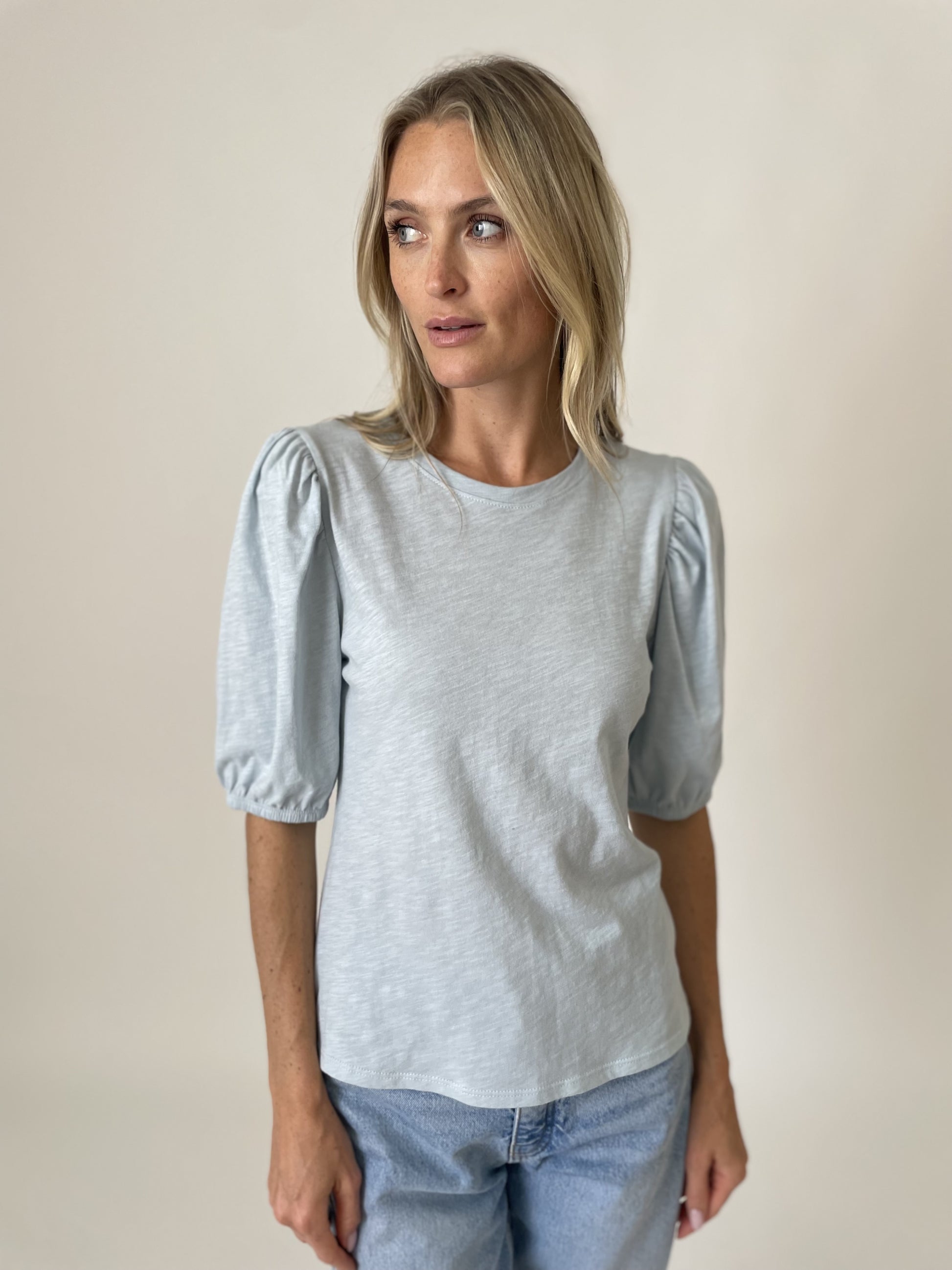 The Rya tee features a short bubble sleeve and crew neckline which can be found in three colors: white, fandango pink and aquamarine. Pair the Rya tee with denim and sneakers for a complete look!