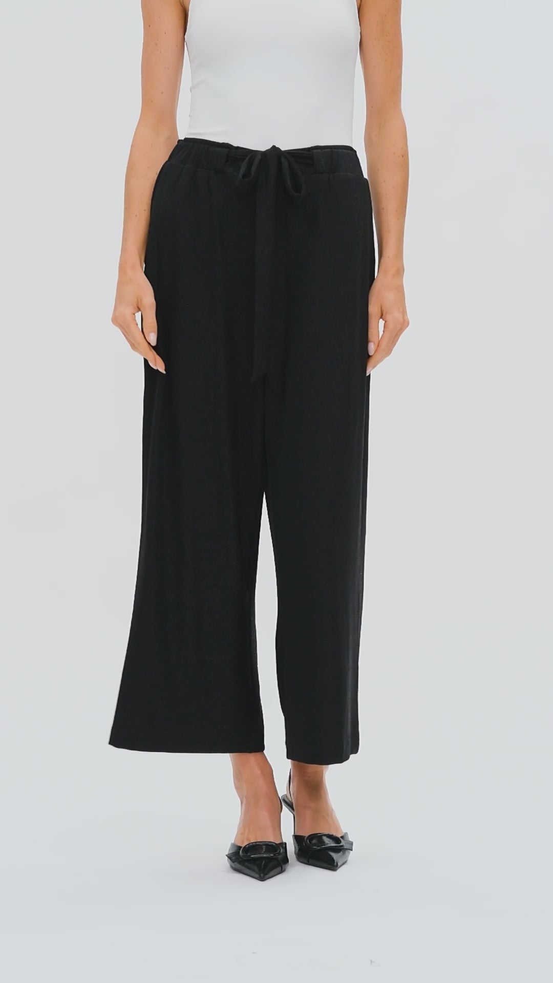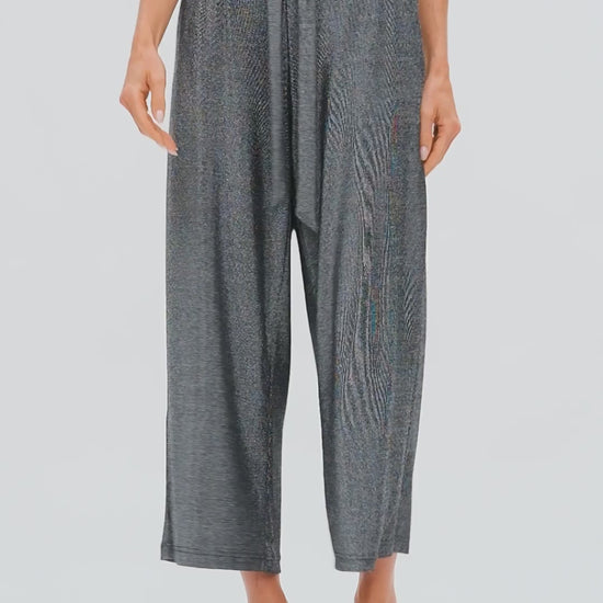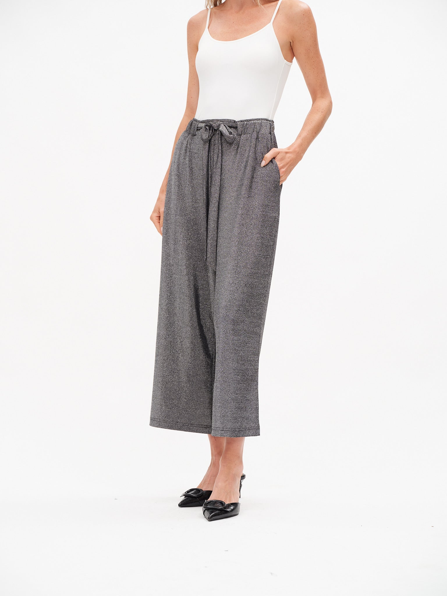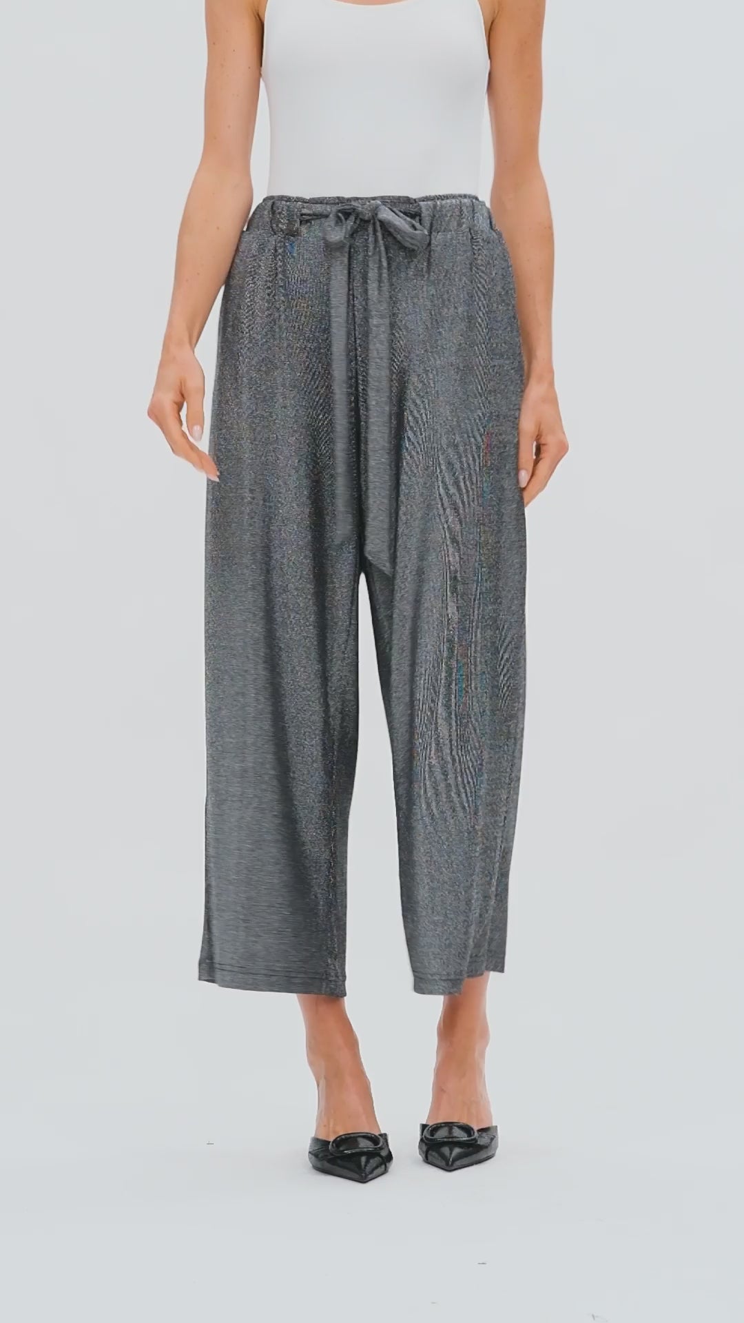 Experience effortless style with the Anywhere Pant, crafted from lightweight, flowy lurex fabric that offers a subtle shimmer in silver and black. These cropped pants feature a comfortable drawstring waist for a customizable fit, perfect for all-day wear. Their breathable, soft texture makes them ideal for any occasion, blending comfort with a chic, modern edge. Elevate your wardrobe with pants designed to move with you, wherever life takes you.