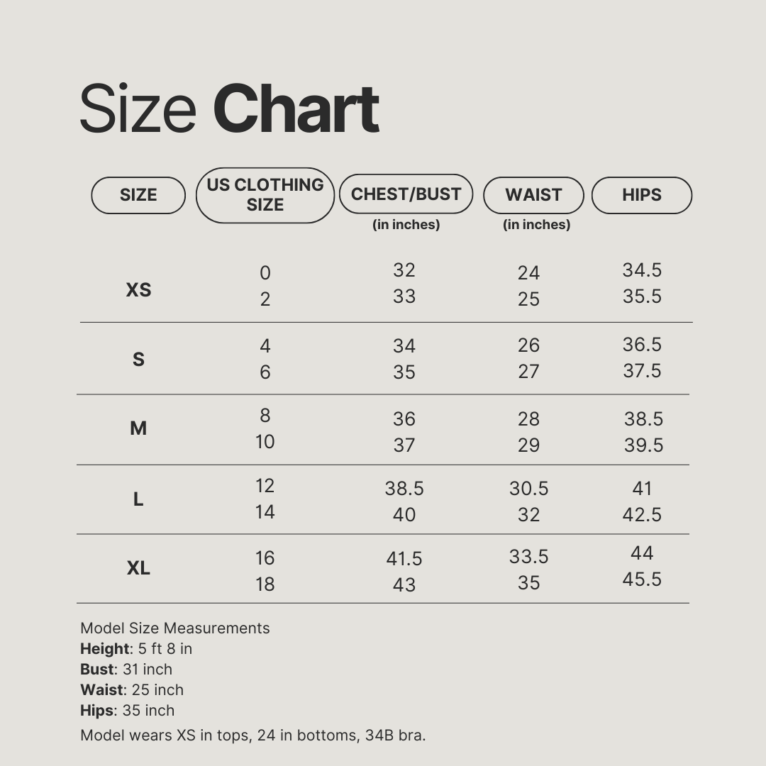 - XS (US 0-2)Chest/Bust: 32-33 inchesWaist: 24-25 inchesHips: 34.5-35.5 inches