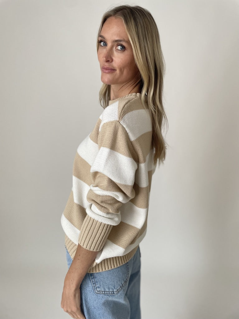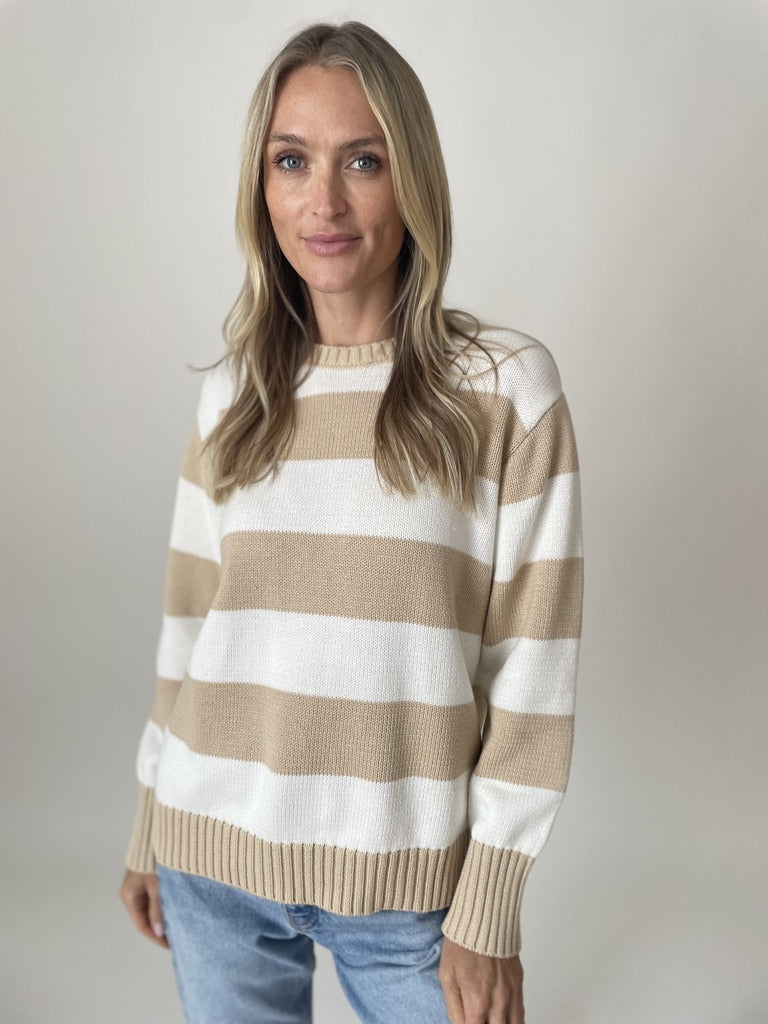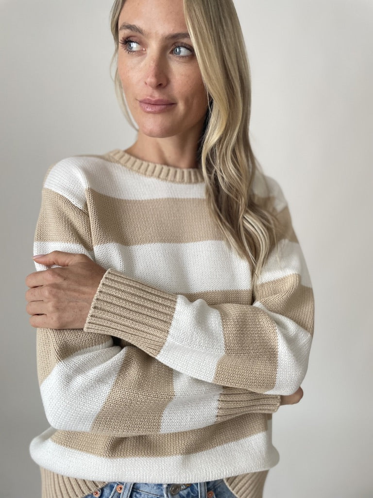 Your new favorite striped sweater is here. The Winnie comes in a grey and khaki color combination, featuring a crew neckline and rib-knit trim. The Winnie pairs perfectly with denim (white, too!) and sneakers.